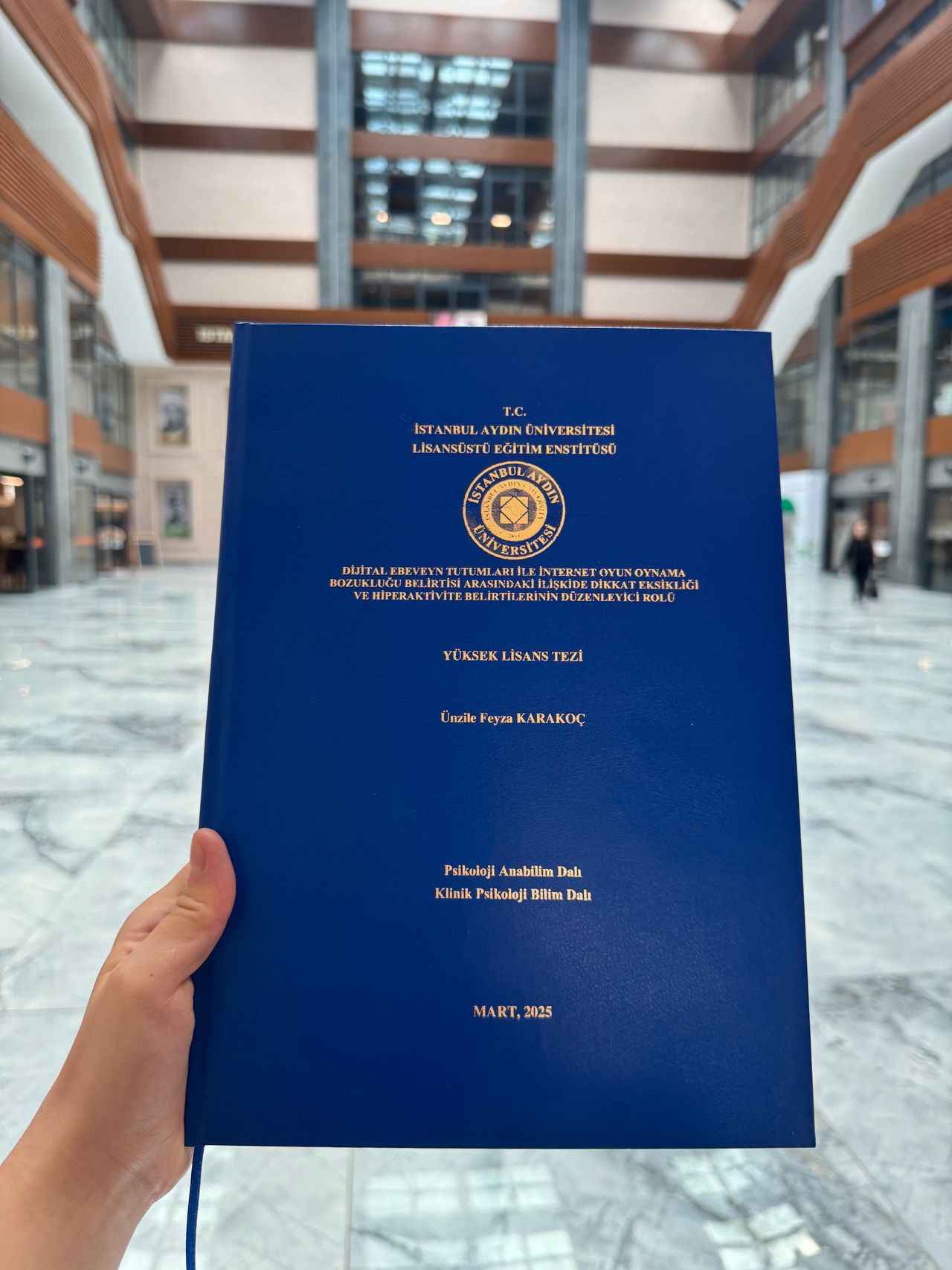 Klinikte karşılaştığım DEHB belirtileri gösteren çocukları gözlemleyerek ve çağımızın sorunu olan Oyun Bağımlılığı ile ilgili araştırmalarımı birleştirdiğim bir konuyla yüksek lisans tezimi taçlandırdım.